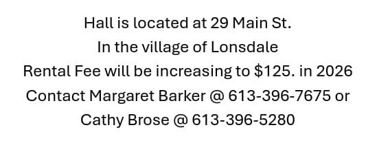 The Lonsdale Women’s Institute provides fun and friendship at monthly meetings and activities. New members welcomed. Meetings are the 1st Wednesday of each month at 7:00 p.m. Contact: Carmel Bell 613-396-5466