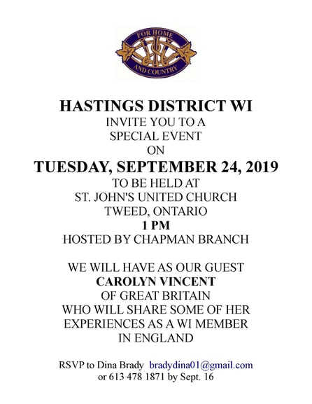 The Chapman Branch of the Women’s Institute was organized May 23, 1950. The meeting was held at the home of Mrs. Harry Coulter with 19 Ladies present. The meeting was presided over by Mrs. Thos. Leslie, District President of East Hastings W.I., Mrs. Harry Sills, the incoming District President was also present. An executive was duly elected and the new Branch flourished.